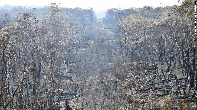 Rừng cây bị cháy sau vụ cháy rừng ở Blue Mountains, cách Sydney khoảng 120 km về phía tây bắc vào ngày 18-12-2019. Ảnh: CNN