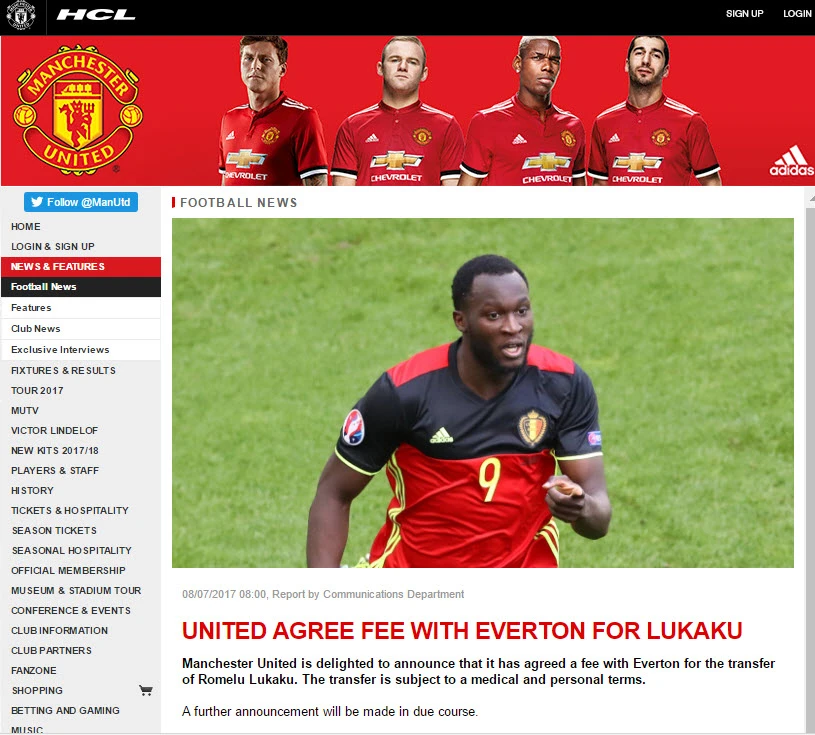Trang chủ CLB Manchester Utd phát ra thông báo ngắn gọn, "Manchester United rất vui mừng thông báo, chúng tôi đã đồng ý với CLB Everton về mức phí chuyển nhượng Romelu Lukaku. Việc chuyển nhượng sẽ được thông qua sau quá trình kiểm tra y tế và các thỏa thuận cá nhân. Thông báo tiếp theo sẽ thực hiện trong thời gian tới".