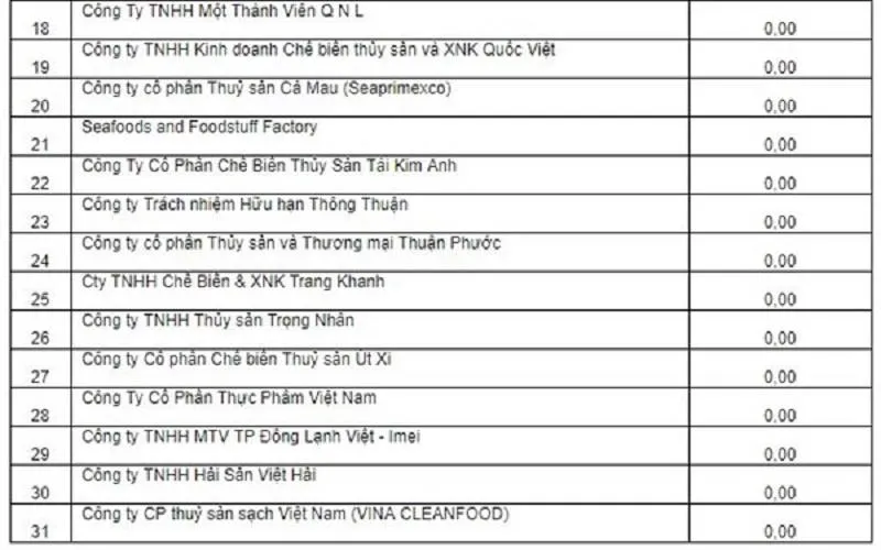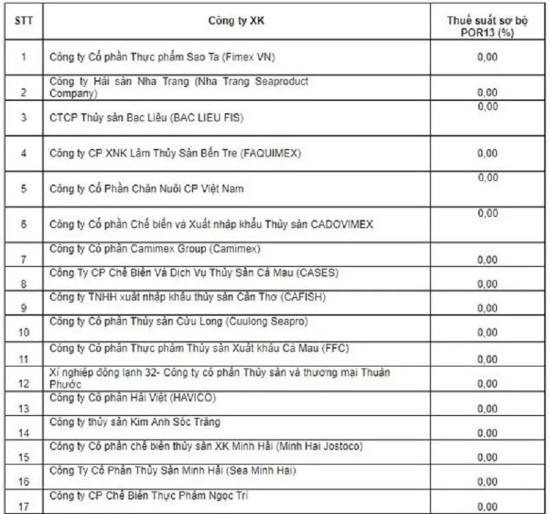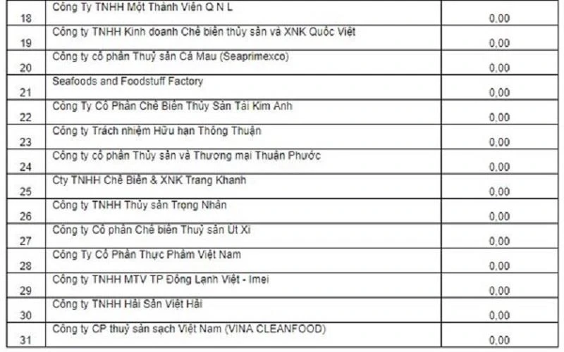 Trong danh sách có rất nhiều doanh nghiệp lớn như Minh Phú, CP Việt Nam, Camimex... Mức thuế của hai bị đơn bắt buộc là Công ty Sao Ta (Sóc Trăng) và Công ty Nha Trang Seafood cũng 0%.