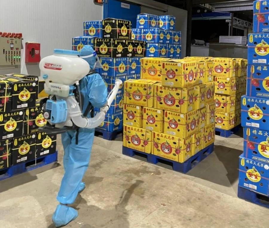 Doanh nghiệp phun khử khuẩn thùng đựng thanh long để tránh virus Sars-CoV-2 trước khi đưa ra thị trường. Ảnh: Minh Phương