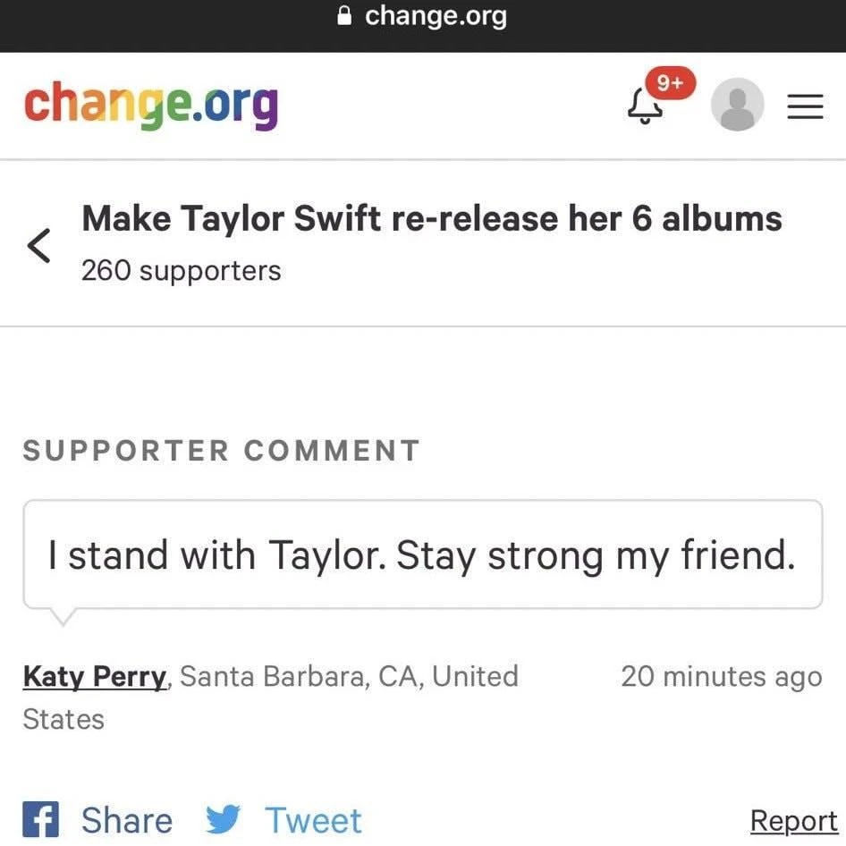 Các fan của nữ ca sĩ cũng đang phát động chiến dịch kêu gọi Taylor tái phát hành 6 album trước đây để thoát khỏi sự thao túng của nhân vật Scooter Braun. Chỉ trong vài giờ đồng hồ chiến dịch đã thu hút gần 100 nghìn chữ ký. Điều đặc biệt là Katy Perry đã kịp dành một chữ ký ủng hộ cô bạn của mình.