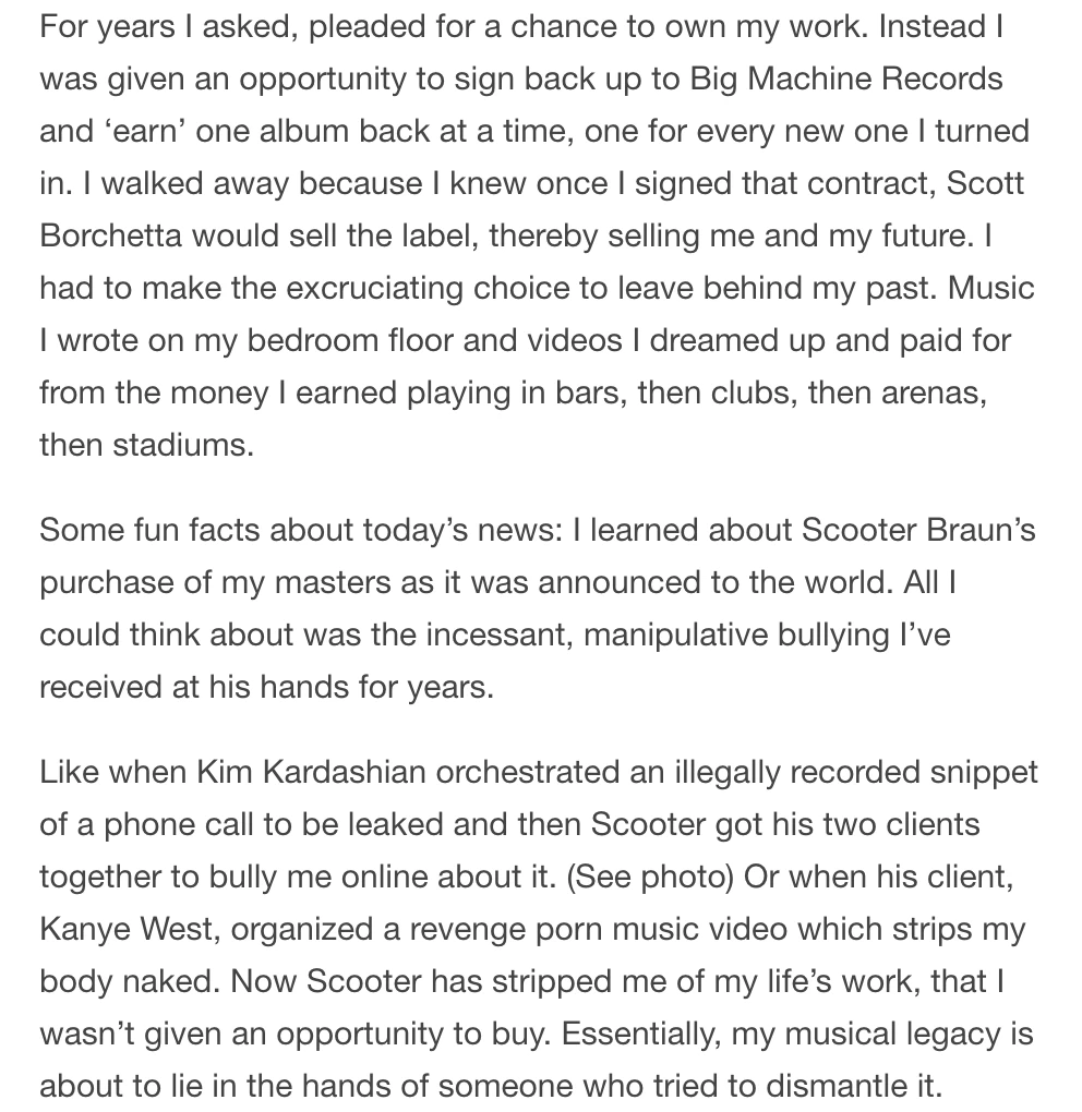 Khi Kim Kardashian dàn dựng một đoạn ghi âm bất hợp pháp cuộc gọi giữa chúng tôi và cố tình tung nó, chỉ để sau đó Scooter, cùng hai khách hàng của ông ta, bắt nạt tôi trên mạng. Hay khi khách hàng của ông ta, Kanye West, dựng nên MV trả thù đầy tính gợi dục với hình ảnh cơ thể khỏa thân của tôi. Bây giờ thì Scooter đã tước đi việc mà cả đời tôi luôn hằng mong, và không cho tôi bất cứ cơ hội nào để chạm đến. Về cơ bản, thành phẩm âm nhạc của tôi giờ đây đã nằm gọn trong tay một người đã từng cố gắng phá hoại nó.