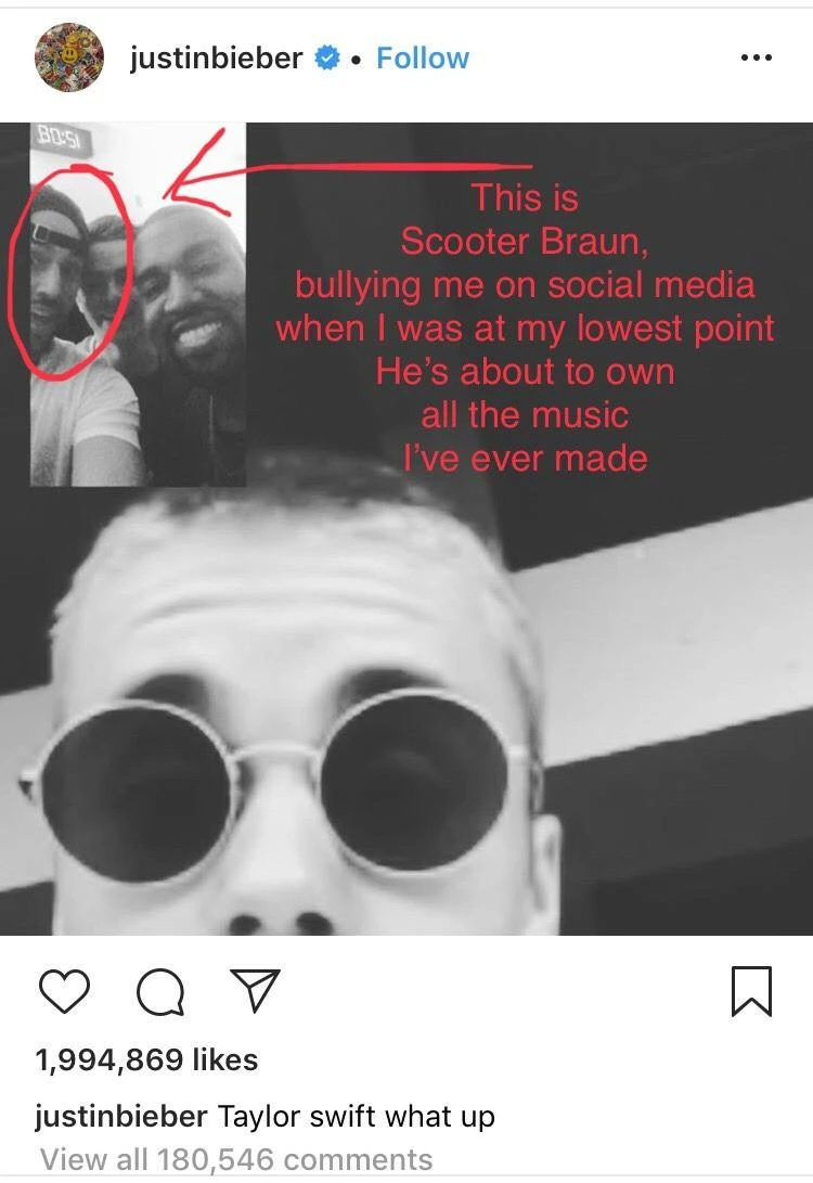 Kèm theo dòng trạng thái nói trên, Taylor Swift đăng kèm theo bức ảnh bắt nạt tập thể có sự xuất hiện của Scooter Braun mà Justin Bieber đã đăng trên Instagram vào năm 2016, khoảng thời gian bùng nổ scandal giữa cô và Kayne West.
