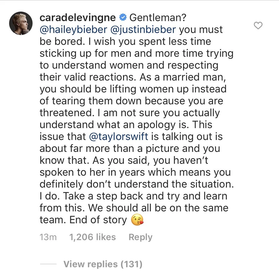 Drama tiếp tục được đẩy lên cao khi hàng loạt sao Hollywood lũ lượt tham gia vào trận chiến. Nàng người mẫu Hailey Baldwin (vợ Justin Bieber) đã dành lời khen có cánh cho chồng mình bằng từ "Gentlement". Đáp trả lại đôi vợ chồng "kẻ tung người hứng", siêu mẫu đình đám Cara Delevigne đã có những dòng ủng hộ người bạn Taylor Swift như sau:
