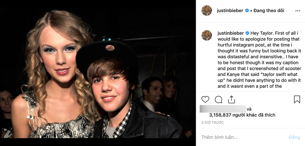 Ngay sau đó, Justin Bieber đã có lời đáp trả Taylor trên Instagram với nội dung mà anh cho là "lời xin lỗi", nhưng dường như lại mang nội dung bênh vực và ủng hộ người bạn thân Scooter Braun.