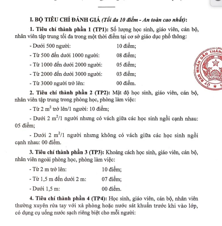 Các tiêu chí thành phần như: số lượng; mật độ; khoảng cách trẻ, giáo viên, cán bộ, nhân viên; thường xuyên rửa tay bằng xà phòng hoặc nước sát khuẩn; đeo khẩu trang trong trường; kiểm tra nhiệt độ; tổ chức đi học bằng xe đưa rước; tổ chức hoạt động ăn sáng, bán trú; phòng cách ly đúng quy định và hoạt động sau 16 giờ 30 phút.