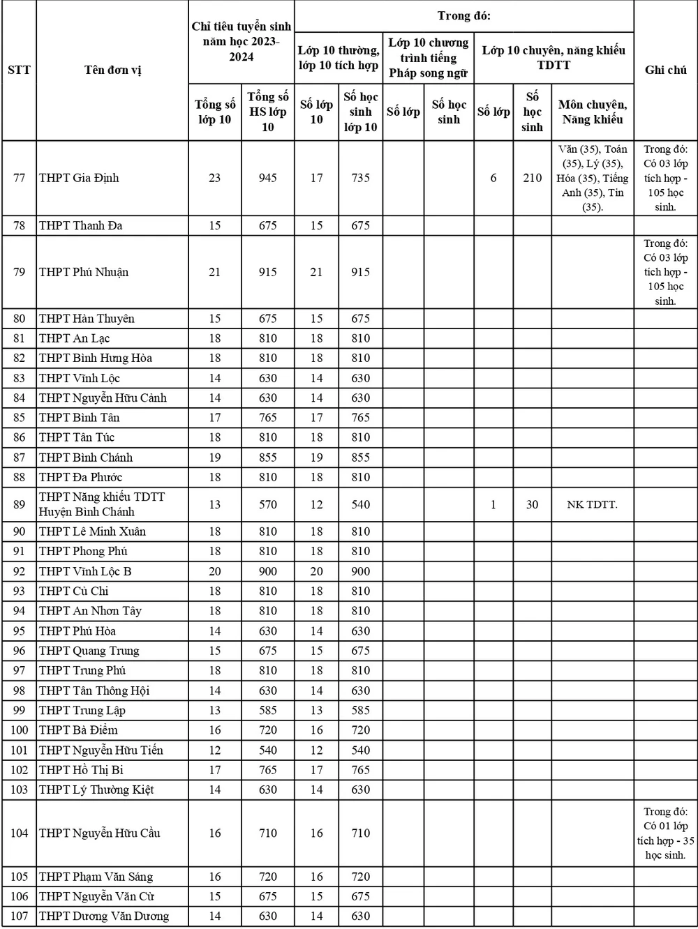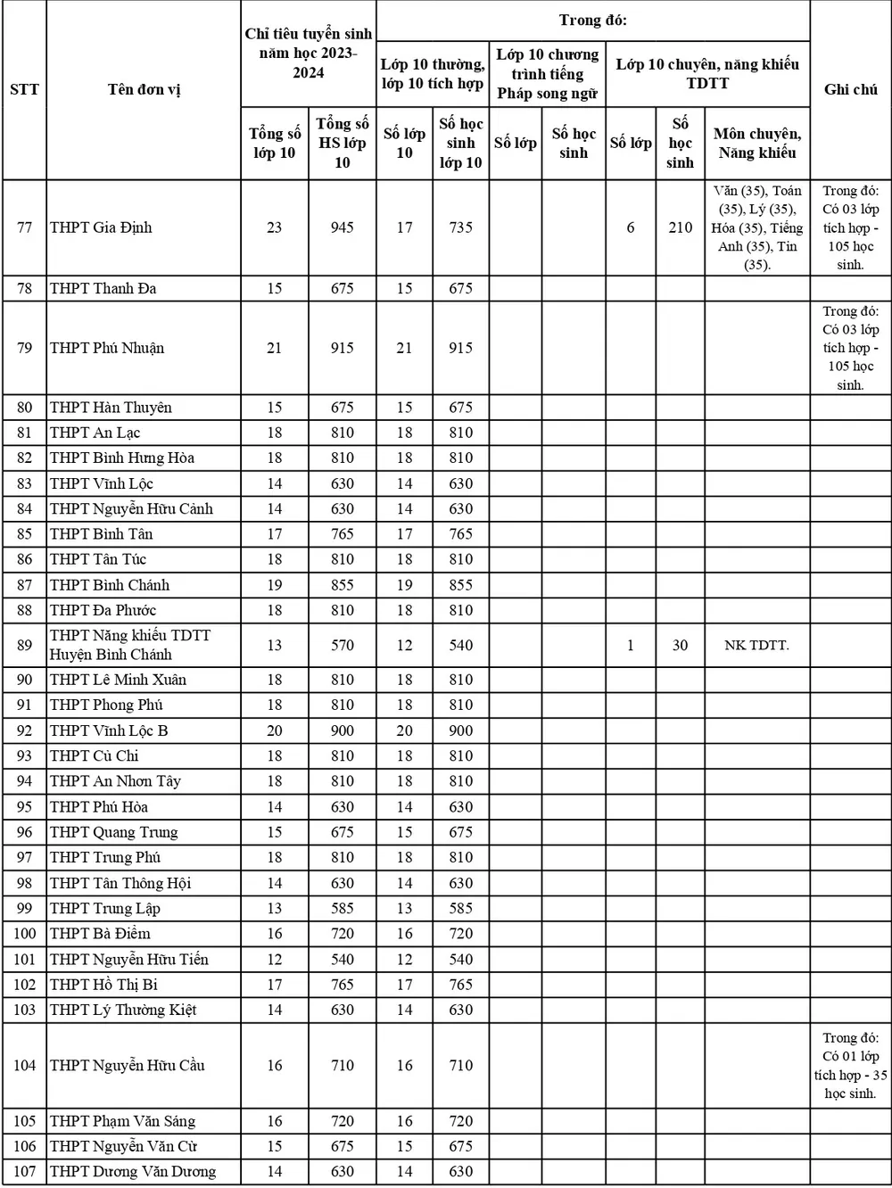 Theo đó, năm nay TP.HCM tuyển sinh tại 114 trường THPT trên địa bàn TP với tổng số chỉ tiêu 77.294 chỉ tiêu lớp 10. Tổng số học sinh lớp 9 trên toàn thành phố năm học này là trên 109.000 học sinh.