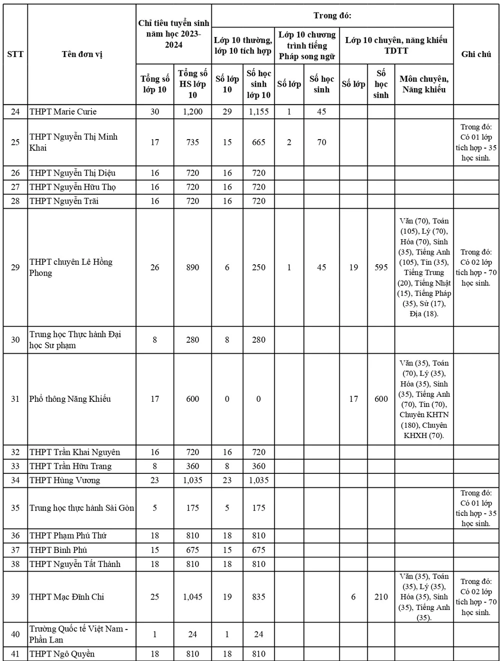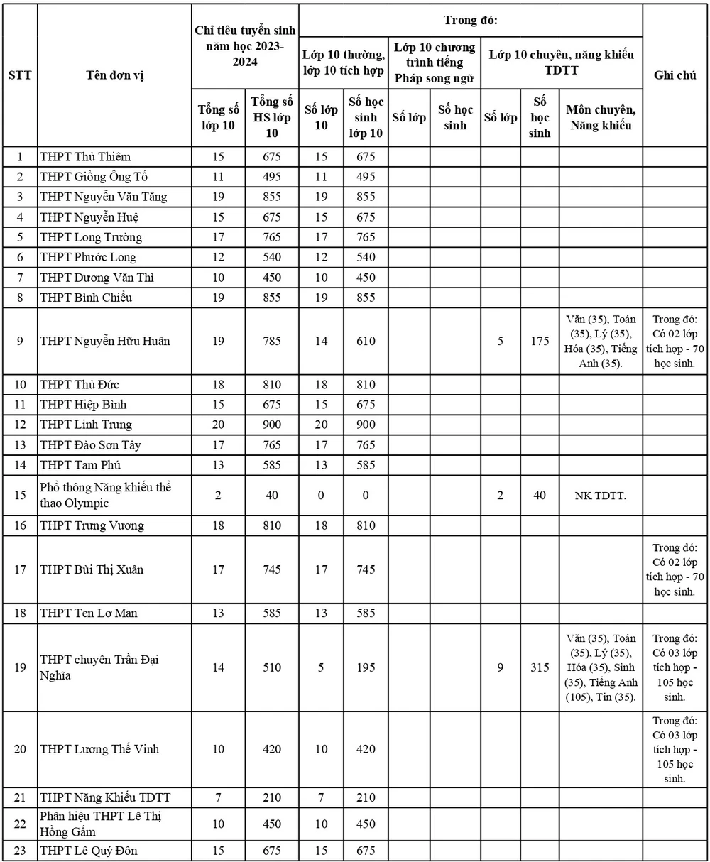 | Chỉ tiêu tuyển sinh vào lớp 10 các Trường THPT tại TP.HCM. Ảnh: NQ | |