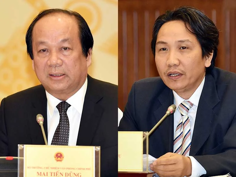 Bộ trưởng - Chủ nhiệm Văn phòng Chính phủ Mai Tiến Dũng: Mong báo chí ủng hộ chủ trương dẹp vỉa hè. Thứ trưởng Bộ Nội vụ Trần Anh Tuấn: Chúng tôi sẽ theo sát vụ bổ nhiệm thần tốc ở Thanh Hóa. Ảnh: Nhật Bắc