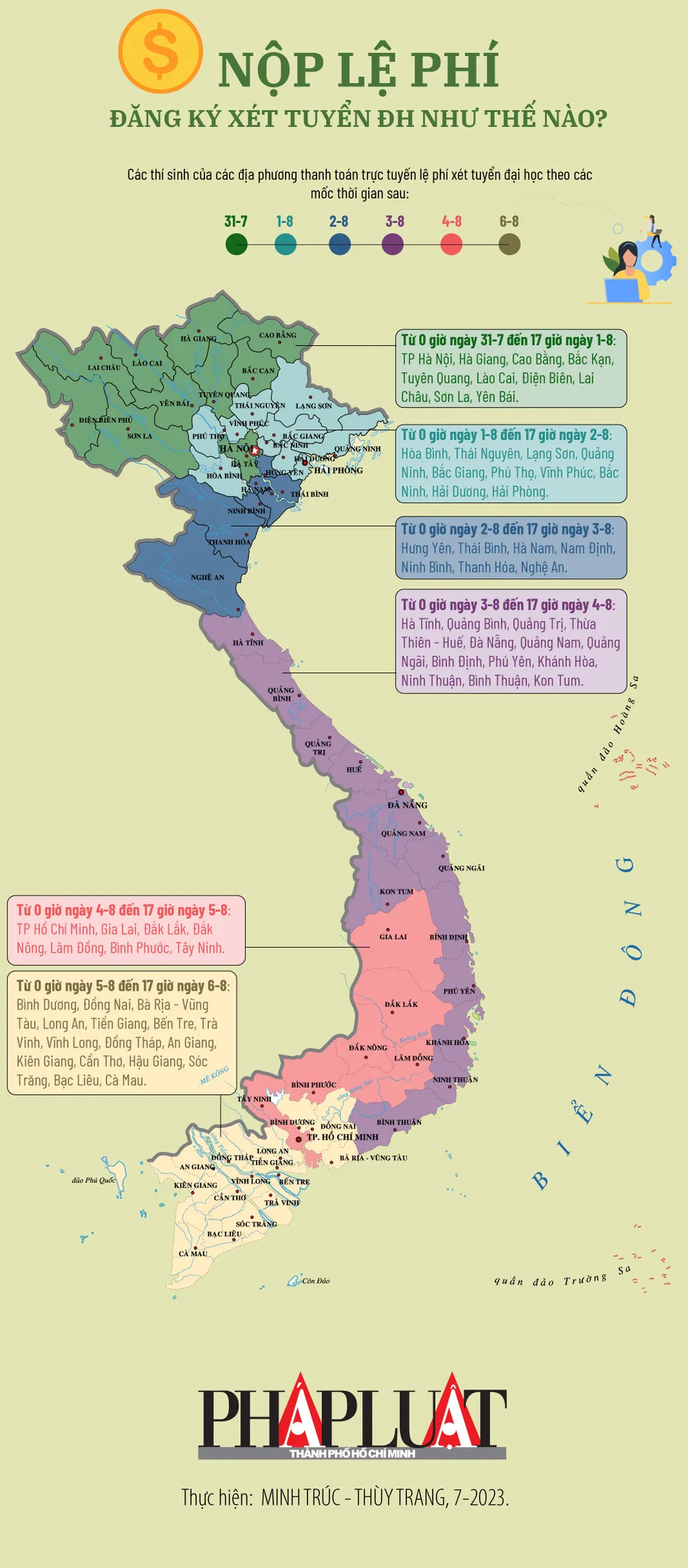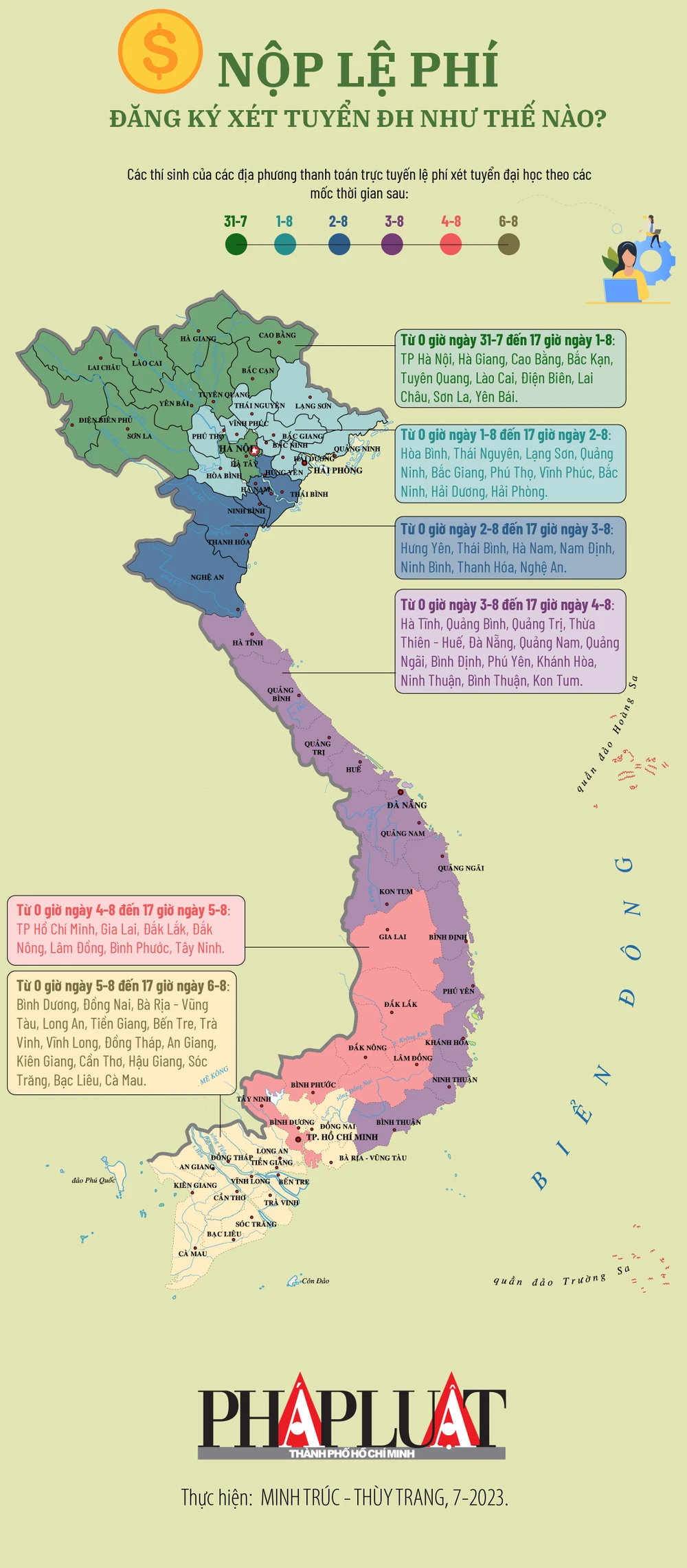 Bộ GD&ĐT đã phối hợp với Văn phòng Chính phủ chuẩn bị hạ tầng kết nối và thanh toán trực tuyến lệ phí đăng ký xét tuyển vào đại học (thông qua Cổng dịch vụ công quốc gia với 17 kênh thanh toán trực tuyến chính của cả nước). Thí sinh thực hiện thanh toán trực tuyến trên hệ thống hỗ trợ đăng ký xét tuyển theo các tỉnh, thành phố (nơi thí sinh đã nộp hồ sơ) như sau: