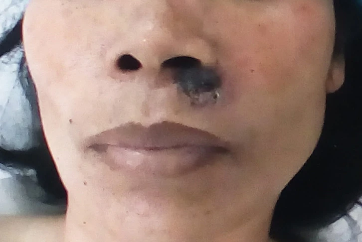 Mới nhất là trường hợp của một nữ bệnh nhân tên NTH (47 tuổi, ngụ Đồng Nai). Bà H. tìm đến BV Ung bướu để khám bệnh nhưng sau khi bà tháo khẩu trang ra, BS Tuấn thấy trên mặt bà có một nốt ruồi ở cánh mũi, một nốt ruồi ở môi trái kích thước 2 x 3 cm có màu đen, cứng, bề mặt lở loét và chảy máu.