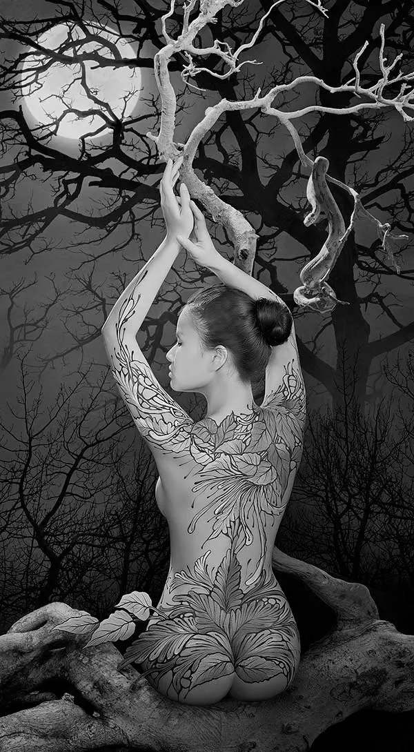 + Đương nhiên là tôi vẽ rồi, vì tôi là họa sĩ trước khi cầm máy ảnh mà! Đây là bộ môn mà trong đó phát huy cả hai sở trường của tôi là hội họa và nhiếp ảnh. Tuy body painting là một bộ môn nghệ thuật độc lập nhưng nếu biết kết hợp nó trong nhiếp ảnh thì sẽ rất tuyệt vời.