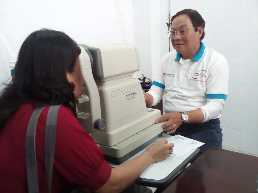 Một giáo viên đang được đo mắt. Ảnh: LÊ BỒNG