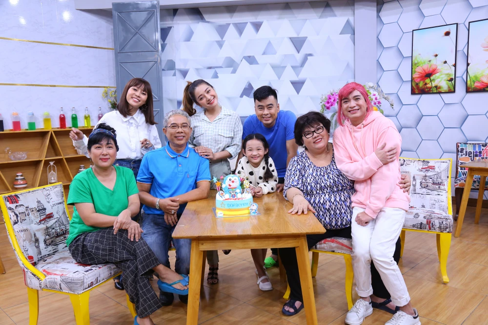 Trung Dân và các diễn viên trong phim bất ngờ tổ chức sinh nhật cho Hữu Đằng. Ảnh: JET