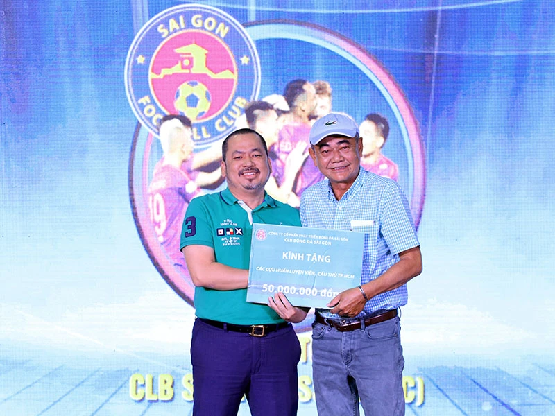 NSND Việt Anh nhận món quà từ bầu Bình của CLB Sài Gòn FC để tổ chức