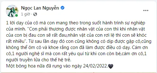 Trên trang cá nhân của mình, NSƯT Chí Tâm đã bày tỏ sự tiếc thương về sự ra đi của người chị đáng kính cũng là người gắn bó với anh trên con đường nghệ thuật.