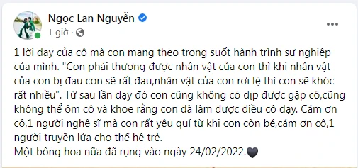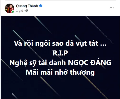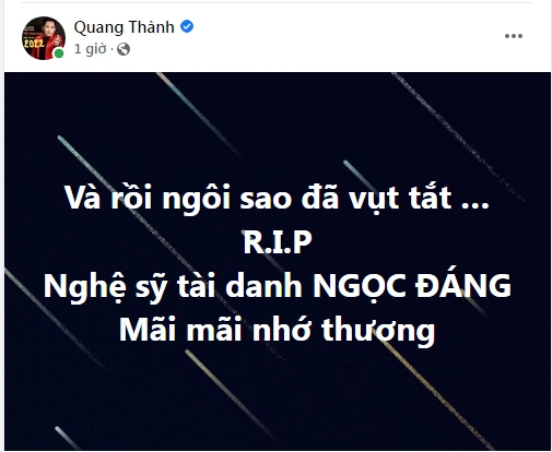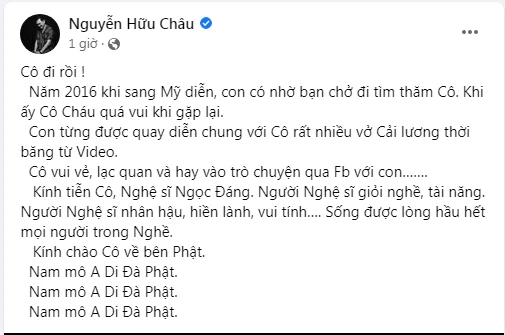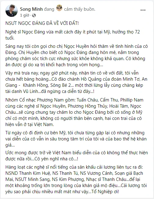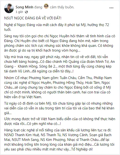 Nam nghệ sĩ viết: "Lại một tin buồn cho giới nghệ sĩ. Nữ nghệ sĩ Ngọc Đáng vừa tạ thế tại miền nam California.