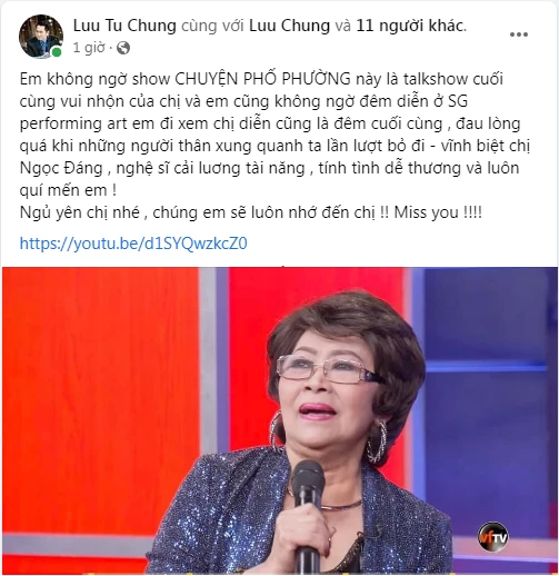 Là người gắn bó với nữ nghệ sĩ ở hải ngoại, ca sĩ Chung Tử Lưu cũng tiếc thương: "Em không ngờ show 'Chuyện phố phường' này là talkshow cuối cùng vui nhộn của chị và em cũng không ngờ đêm diễn ở SG performing art em đi xem chị diễn cũng là đêm cuối cùng , đau lòng quá khi những người thân xung quanh ta lần lượt bỏ đi - vĩnh biệt chị Ngọc Đáng , nghệ sĩ cải luơng tài năng , tính tình dễ thương và luôn quý mến em !