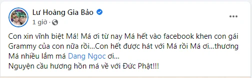 Nam diễn viên Gia Bảo cũng chia sẻ: "Con xin vĩnh biệt má! Má ơi! Từ nay má hết vào facebook khen con gái Grammy của con nữa rồi. Con hết được hát với má rồi má ơi! Thương Má nhiều lắm má Ngọc Đáng ơi…