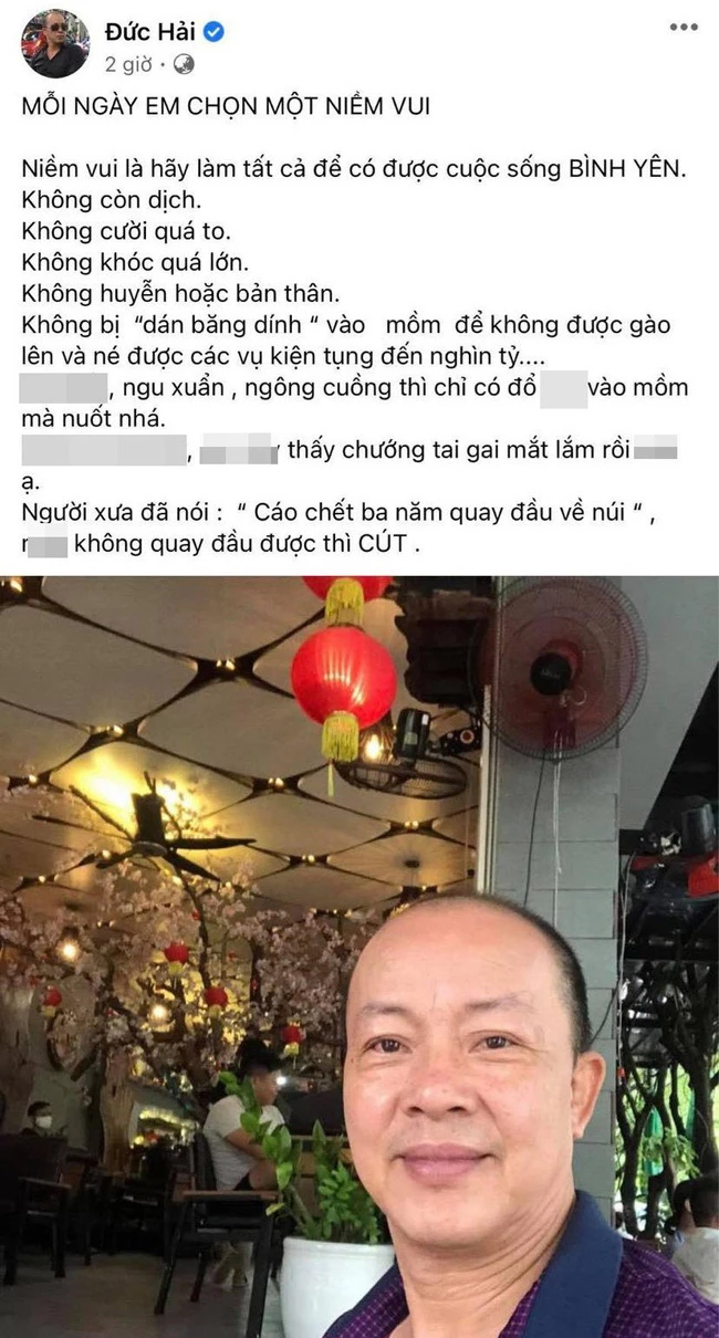 Trước đó, vào ngày 2-6, mạng xã hội xôn xao khi trên trang Facebook của NSƯT Đức Hải (có tick xanh) xuất hiện nội dung: “Mỗi ngày em chọn một niềm vui. Niềm vui là hãy làm tất cả để có được cuộc sống bình yên. Không còn dịch. Không cười quá to. Không khóc quá lớn. Không huyễn hoặc bản thân. Không bị “dán băng dính” vào mồm để không được gào lên và né được các vụ kiện tụng đến nghìn tỷ. …, ngu xuẩn, ngông cuồng thì chỉ có đổ … vào mồm mà nuốt nhà. … con …, … thấy chướng tai gai mắt lắm rồi con ạ. Người xưa đã nói “cáo chết ba năm quay đầu về núi”, mày không quay đầu được thì cút". Bên cạnh đó là phần comment (phản hồi) với nhiều ngôn từ khiếm nhã.