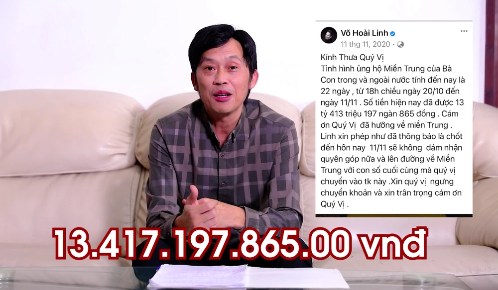 Suốt những ngày qua truyền thông đặt vấn đề về số tiền hơn 13 tỷ từ thiện NSƯT Hoài Linh quyên góp ủng hộ đồng bào miền Trung. Chiều tối 24-5, NSƯT Hoài Linh đã trả lời chính thức về số tiền từ thiện dành cho miền Trung thông qua video gửi đến một số cơ quan báo chí.