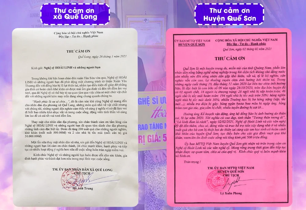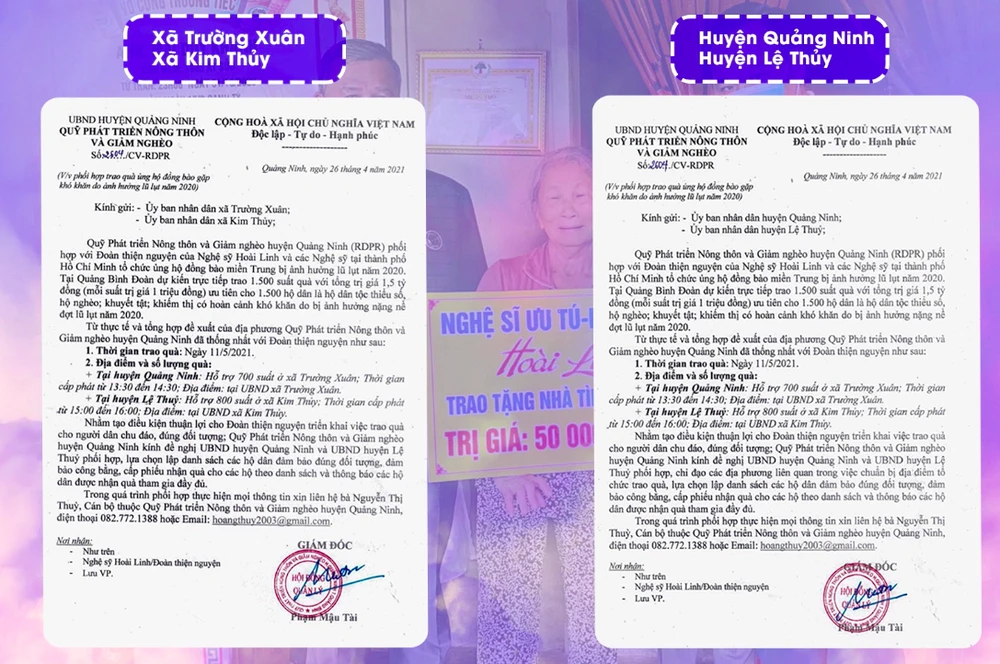 | Theo văn bản NSƯT Hoài Linh cung cấp trong video, anh đã trao: - 200 suất quà (500.000đ/suất) và hỗ trợ 2 căn nhà tốc mái (50 triệu/căn) vào ngày 26-1-2021 tại xã Quế Long, huyện Quế Sơn. - Hỗ trợ xây dựng nhà ở, quà cho học sinh khó khăn… tại huyện Quế Sơn tổng giá trị 500 triệu đồng vào ngày 2-2-2021.