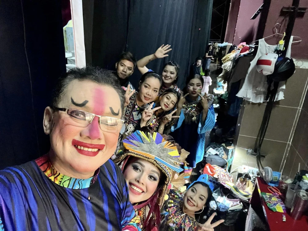 NSƯT Hữu Châu chụp ảnh cùng các diễn viên và anh em hậu đài. Ảnh: FBNV |