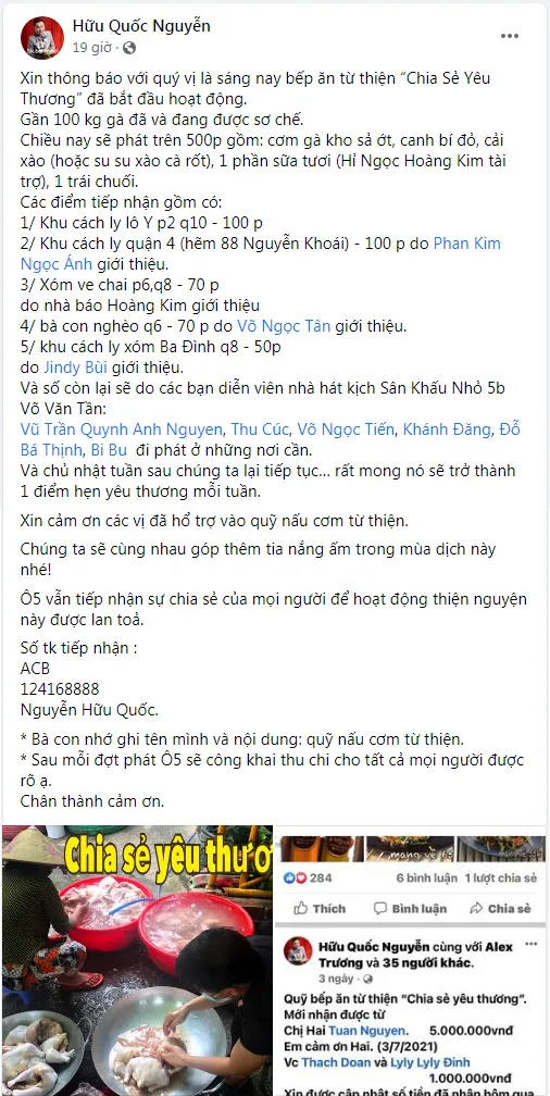 Trưa 4-7, trên trang cá nhân, NSƯT Hữu Quốc cho biết sau khi kêu gọi và nhận được sự ủng hộ của nhiều mạnh thường quân cũng như bạn bè, nghệ sĩ thì quỹ bếp ăn từ thiện đã bắt đầu hoạt động.