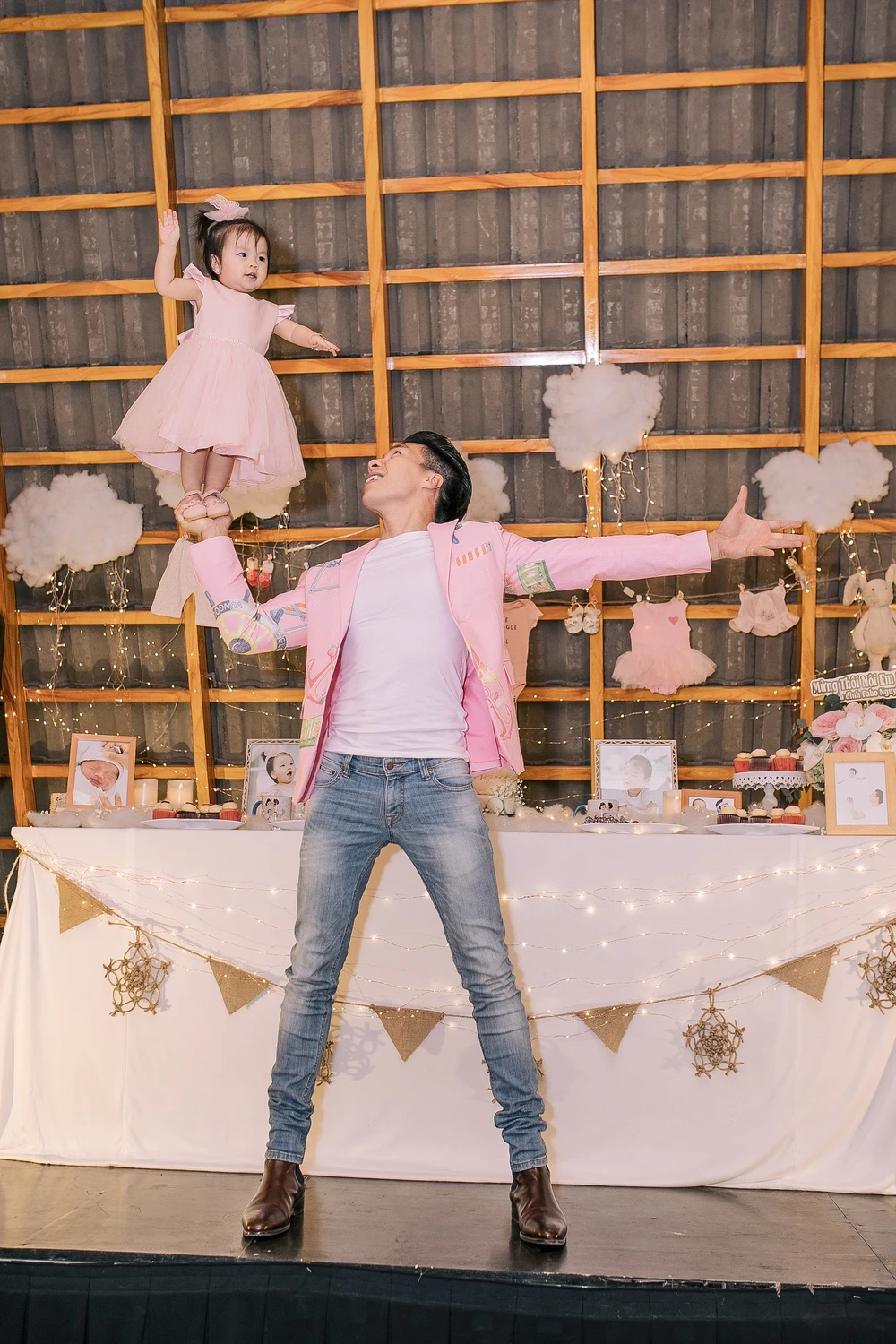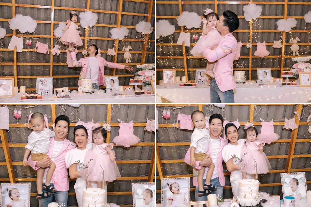 Buổi tiệc nhỏ diễn ra trong không gian ấm áp, được bà xã Ngọc Mai và những người thân tự tay trang trí với những vật dụng gần gũi, giản dị nhưng không kém phần tinh tế với tông màu hồng chủ đạo, màu mà bé Mì Mí Tâm An yêu thích. Tất cả toát lên sự chăm chút tỉ mỉ với đong đầy tình cảm mà cả gia đình “Dính một cục” dành cho cô công chúa nhỏ.