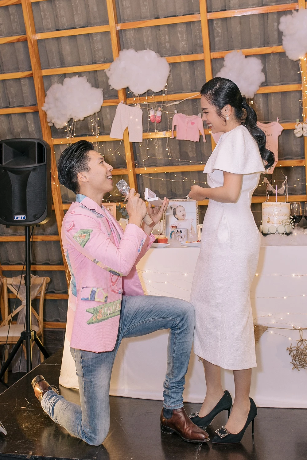 Cũng tại tiệc thôi nôi, NSƯT Quốc Nghiệp bất ngờ cầu hôn bà xã Ngọc Mai sau bốn năm về chung một nhà và có cùng nhau hai mặt con.