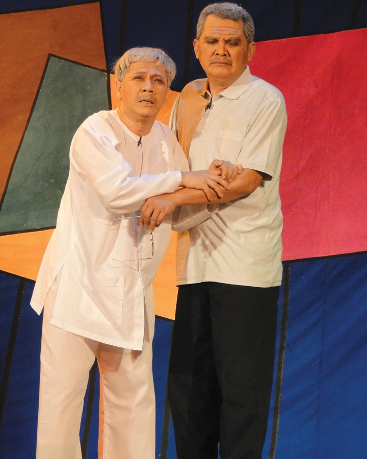 Nghệ sĩ Thành Lộc (vai ông Tư), nghệ sĩ Hữu Châu (vai ông Năm) trong vở Dạ cổ hoài lang. Ảnh: TL