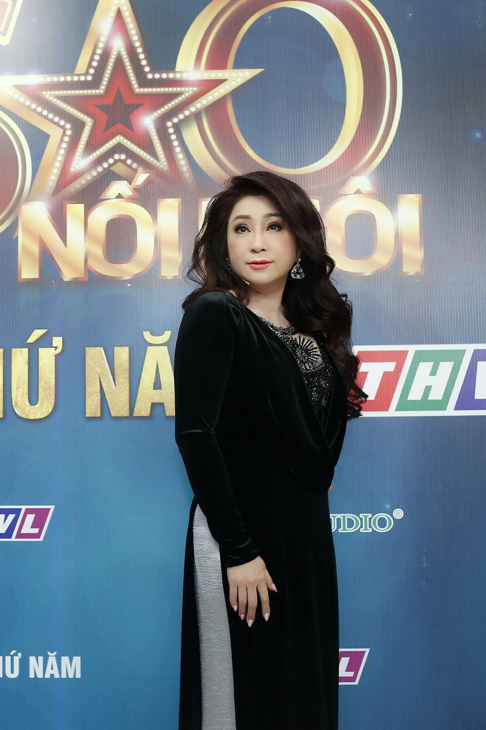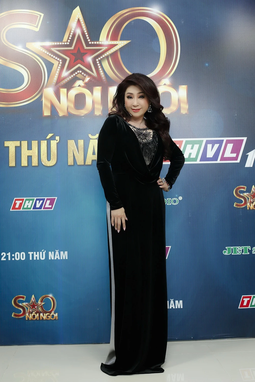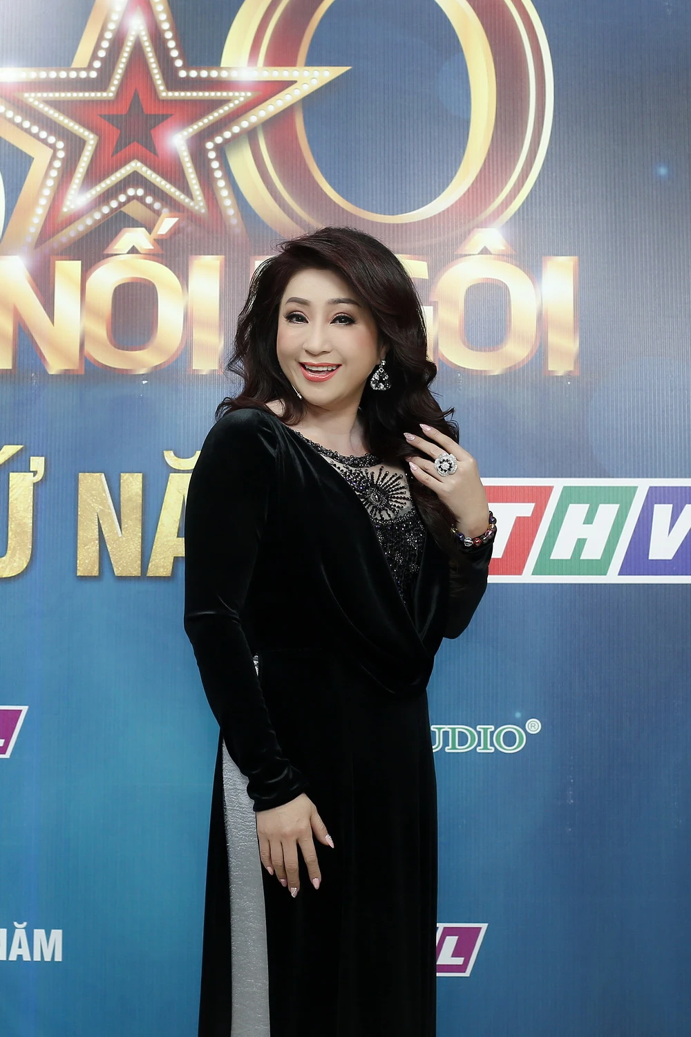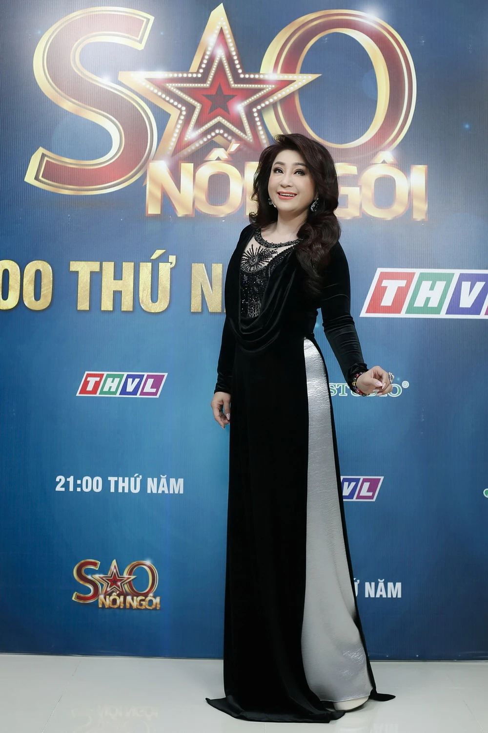Xuất hiện tại chương trình, NSƯT Thoại Mỹ khoe vẻ đẹp không tuổi với áo dài đen biến tấu cùng mái tóc uốn xoăn dịu dàng.