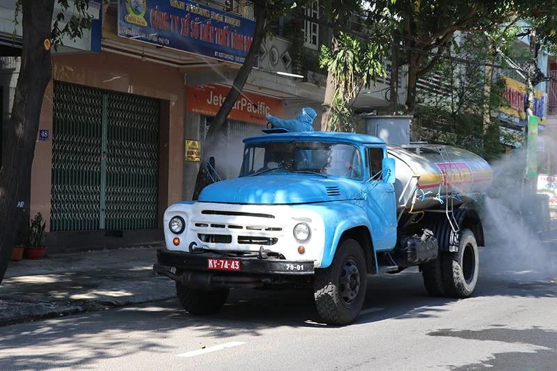 Lực lượng quân đội phun hóa chất khử khuẩn trên đường phố Tuy Hòa. Ảnh: VŨ XUÂN