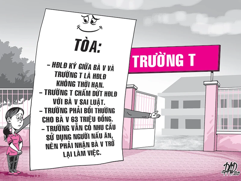 Xử sơ thẩm vào tháng 10-2019, TAND huyện Lâm Hà (Lâm Đồng) đã chấp nhận một phần yêu cầu khởi kiện của bà V., hủy quyết định chấm dứt HĐLĐ đối với bà, buộc trường phải bồi thường cho bà V. hơn 63 triệu đồng.