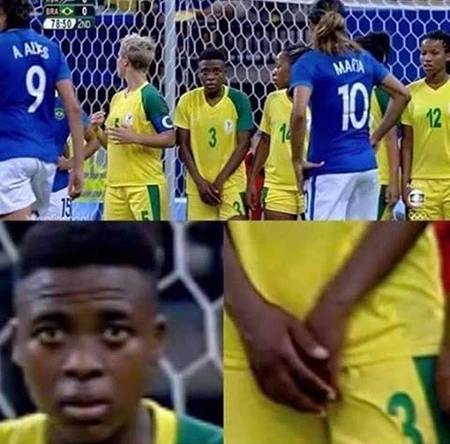 Hành động trên diễn ra trong trận đấu bóng đá nữ giữa chủ nhà Brazil và Nam Phi tại Olympic Rio 2016. Phút 79 của trận đấu, đội tuyển Brazil được hưởng quả đá phạt trực tiếp, trong lúc lập hàng rào, hậu vệ Vilakazi của Nam Phi đã có hành động khó hiểu khi cô lấy tay che vùng kín như một cầu thủ nam thực thụ.