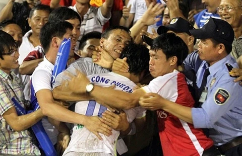 Công Phượng mừng bàn thắng bằng cách lên tận khán đài ôm cha mình. Ảnh: XUÂN HUY