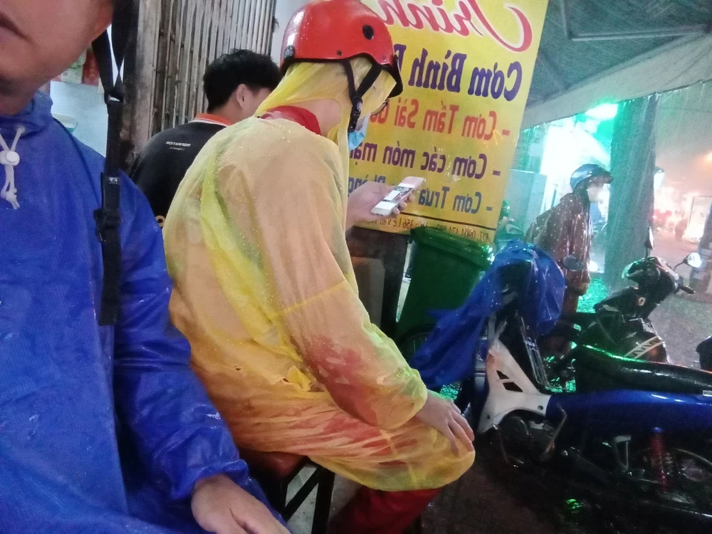 Trước một quán cơm đã đóng cửa có phần bạt che nhô ra đủ rộng để không bị nước mưa hắt, một số người dắt xe tới đứng.