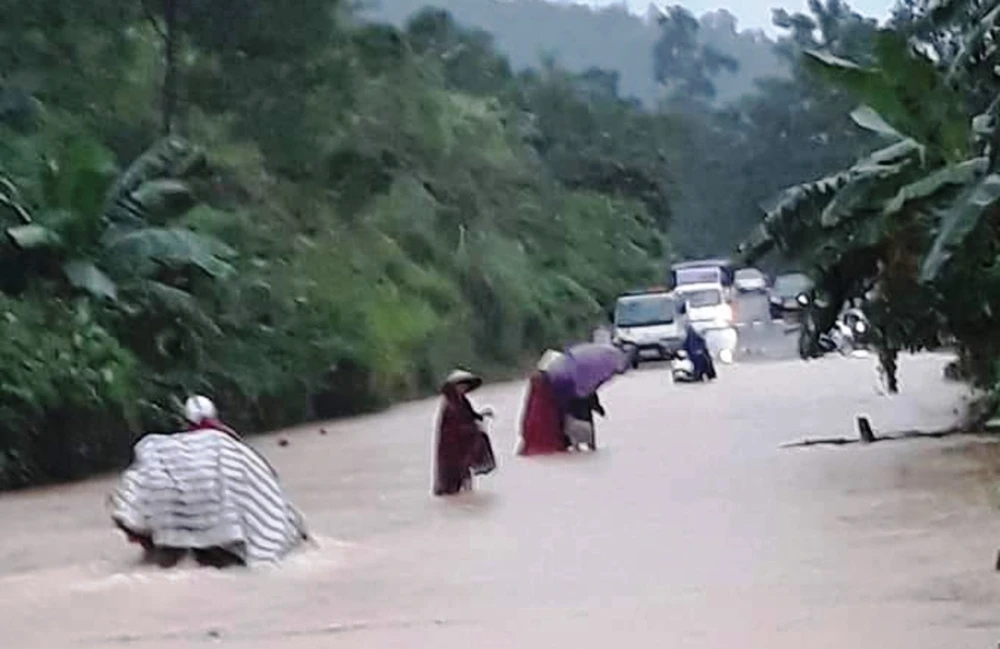 Hình ảnh mưa lụt ngập đường vào ngày 29-10-2020 trên địa bàn xã Khai Sơn. Ảnh: ĐL