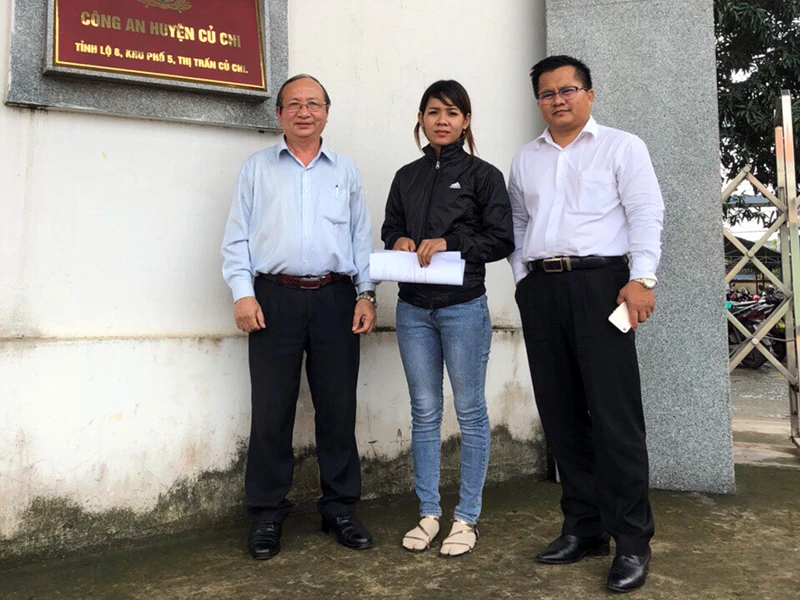 Thạch Thị Bé Trúc cùng các LS Trịnh Công Minh, Kim Ron Tha tại Công an huyện Củ Chi. Ảnh: TV