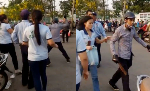 Lúc này một số bảo vệ của công ty đã chạy ra can ngăn, có người dùng gậy vụt vào thanh niên này thì hắn mới dừng lại và cùng vợ bỏ đi. Cô gái bị thương nặng và được xe cấp cứu của công ty đưa đến bệnh viện cấp cứu. Thấy sự việc nghiêm trọng, bảo vệ của công ty đã chặn thanh niên này lại đồng thời báo cơ quan công an.