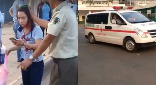 Nữ công nhân trẻ bị thương và được xe cấp cứu của công ty đưa đi cấp cứu. (Ảnh cắt từ clip)