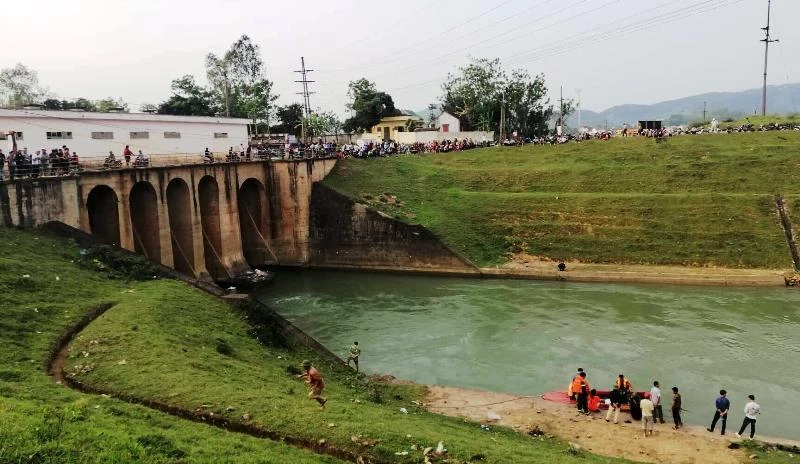 Hàng trăm người dân hiếu kỳ đang đứng bên cống Mụ Bà theo dõi công tác tìm kiếm, cứu nạn.