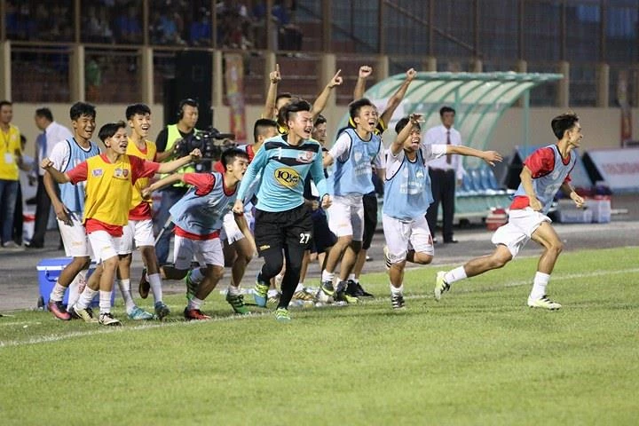 Cầu thủ trẻ HA Gia Lai vỡ òa niềm vui chiến thắng.