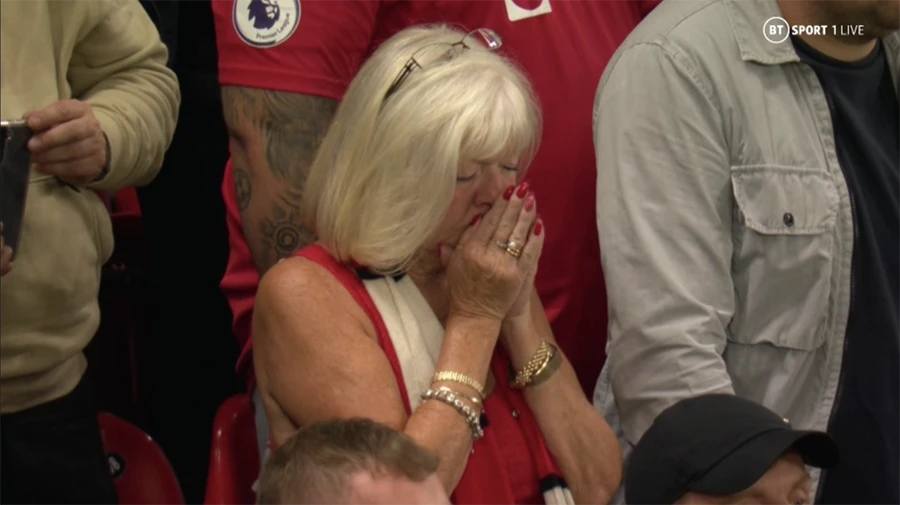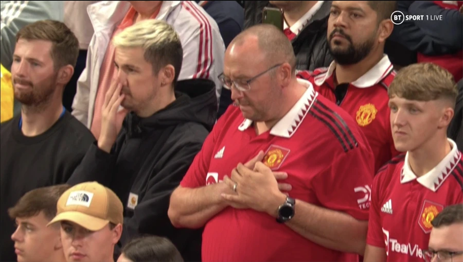 Mọi người trên sân Old Trafford và London dành một phút mặc niệm thể hiện sự kính trọng Nữ hoàng Anh. ẢNH: SUN SPORTS |