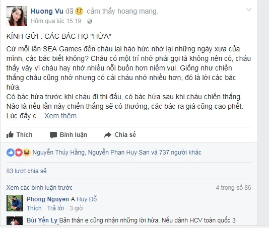 Thế rồi, sau khi tưng bừng hết niềm vui này đến chồng chất niềm vui khác. Cuối cùng cháu cứ dài cổ đợi, hết ngày này qua ngày khác, tháng này qua tháng nọ... rồi bao kỳ SEA Games đã đi qua mà phần thưởng của các bác vẫn không đến tay” - Vũ Thị Hương chia sẻ trên trang cá nhân của mình.