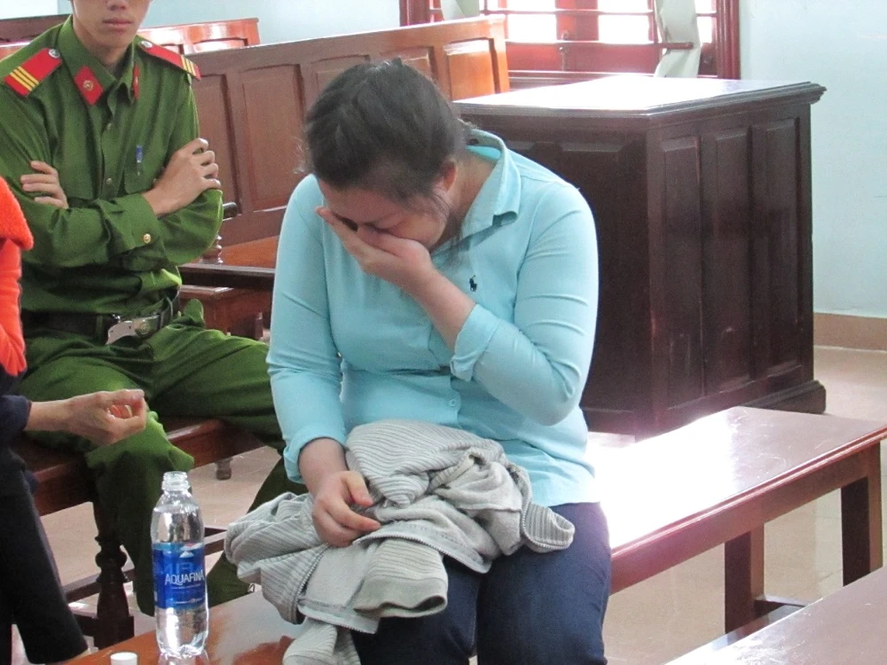 Yến khóc khi nói chuyện với người thân khi chờ tòa nghị án. Do thời tiết trở lạnh, người thân bị cáo xin phép gửi thêm áo ấm cho bị cáo và được cảnh sát hỗ trợ tư pháp đồng ý. Ảnh: NN