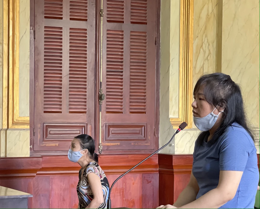 Trâm đang trả lời HĐXX và đồng phạm Cúc tại toà. Ảnh: H.YẾN