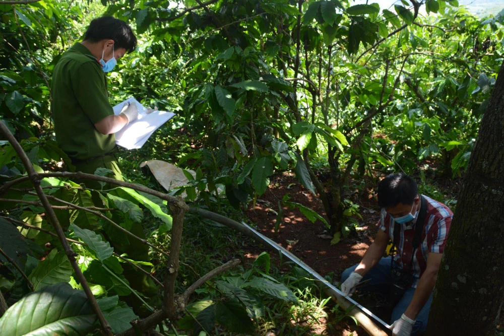Đến khoảng 1 giờ sáng 25-5, người dân phát hiện trong vườn cà phê nhà bà Nhi có dấu đất mới đào và có một phần thi thể trồi lên mặt đất nên báo ngay cho công an.