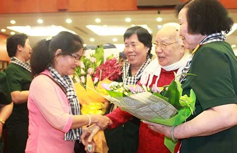 Các nữ pháo binh vui mừng gặp lại. Ảnh: L.THOA