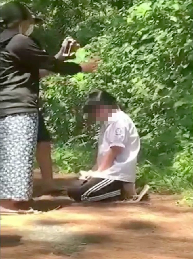 Đoạn video dài một phút có hình ảnh một nữ sinh bị bắt quỳ trên đường đất để một cô gái liên tiếp làm nhục, dùng tay đánh vào mặt.